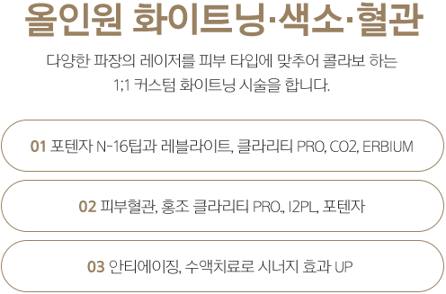 다양한 화이트닝 레이저 시술을 결합하여 시술합니다. 피부 타입에 맞는 레이저만을 선택하여 시술하고,